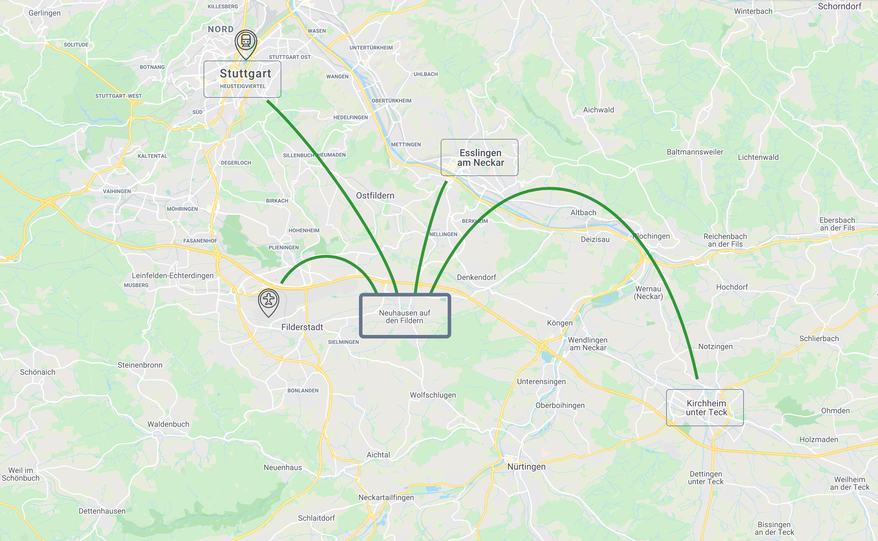 Die ideale Lage von Neuhausen a.d.F. ermöglicht es, in kürzester Zeit Flughafen, Hauptbahnhof und große Nachbarstädte mit Öffentlichen Verkehrsmitteln zu erreichen.